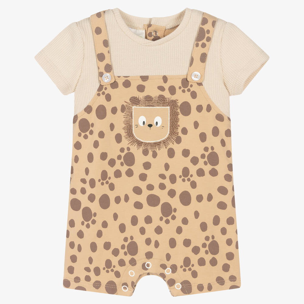 Brown aniaml print shortie for baby boys and girls by iDO Mini. Soft and stretchy, it has a cute lion face motif, with poppers down the back and between the legs for easy dressing and changing.