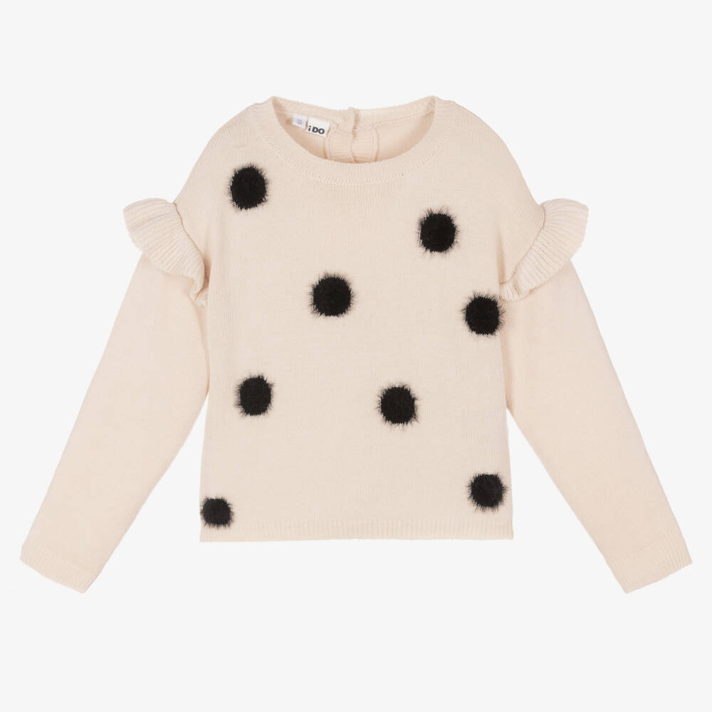 Super soft and cosy, this beige sweater for girls is by iDO, knitted in a cotton blend for all-day comfort. It is fun and stylish too, with fluffy black polka dots and ribbed frills over the shoulders. Easy to put on, it has a button fastening around the back.