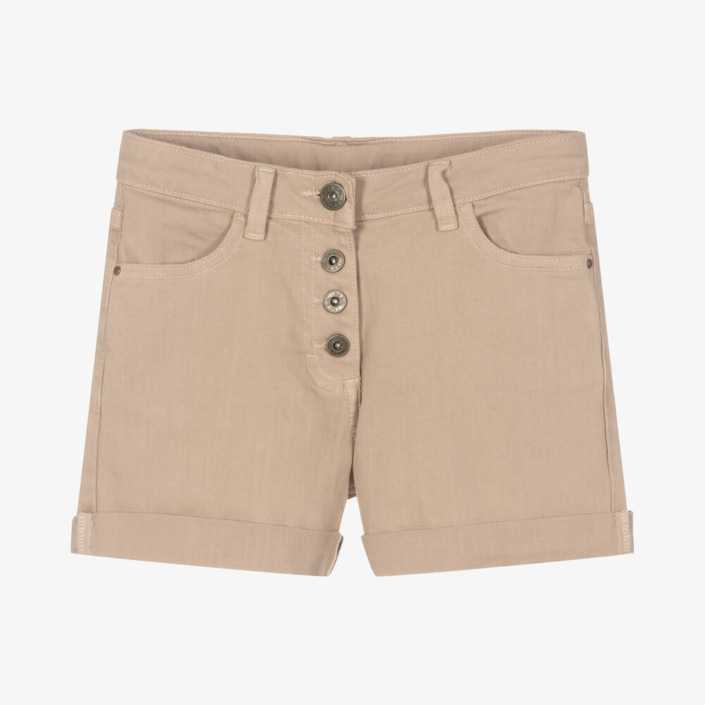 Casual beige cotton shorts for girls by Italian brand iDO Junior, made in comfortable twill with fixed turn-ups. With four pocket jeans styling, they have a useful adjustable waist for a good fit and fasten with buttons on the front.