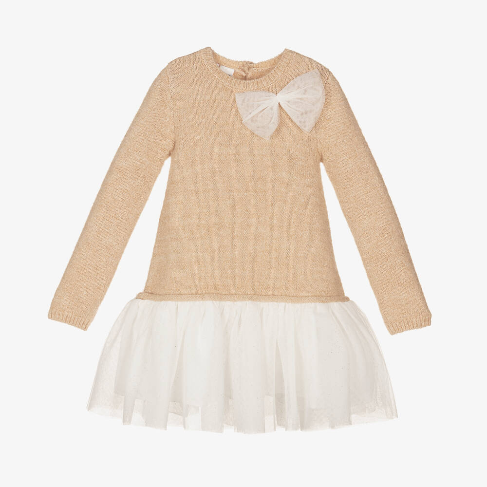 Girls Beige Knit & White Tulle Dress