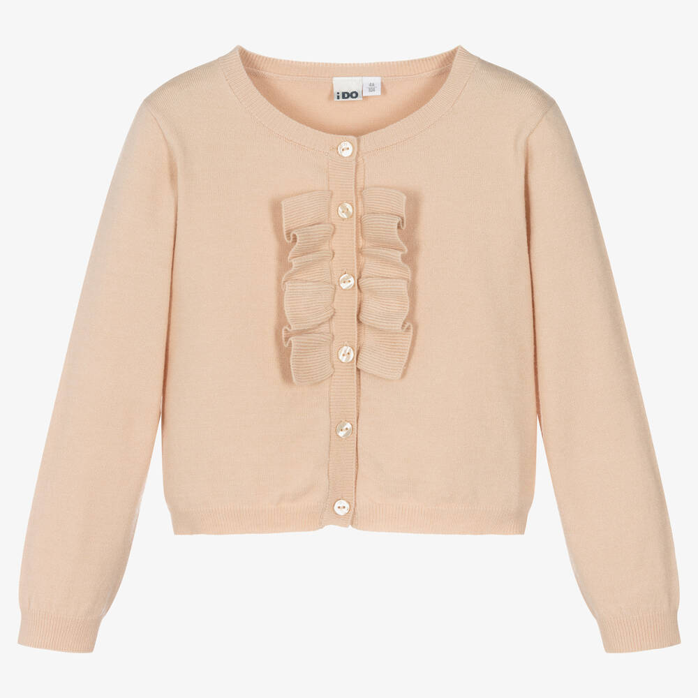 A lovely beige cardigan for girls by iDO Baby, knitted in a super soft viscose blend yarn. There are knitted ruffles on the buttoned placket down the front, adding sweet detailing to this layering piece.