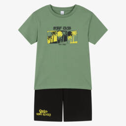 Stylish black tracksuit set for older girls by iDO Junior, made in mid-weight cotton jersey. The hoodie has a contemporary, cropped design, with a boxy fit, dropped shoulders and cargo pockets on the sleeves. It features a white inspirational slogan on the back and a patch on the hood. The wide-leg joggers have a matching white patch on the elasticated waistband and a cargo pocket on each leg. The set is completed by a short-sleeved T-shirt with the same white slogan on the front.