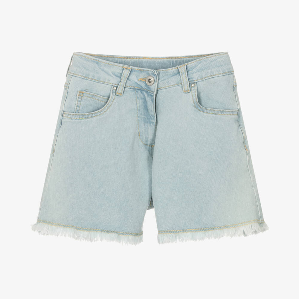 Light blue shorts for girls by Italian brand iDO Junior, made in a soft denim with a slight stretch. These wide-leg shorts have a zip and button fastening, classic five-pocket styling and frayed hems. They have an adjustable waist for an ideal fit.