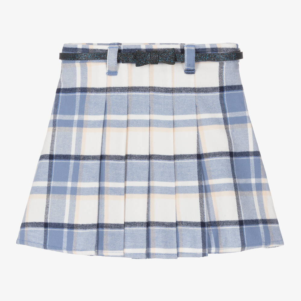 By iDO Baby, a cornflower blue and ivory tartan skirt for girls, made in soft, brushed cotton flannel. Woven with sparkling thread, this pleated skirt has a neat hidden side zip and a comfortable cotton twill lining. Included, is a glittery blue belt with a decorative bow and pin buckle fastening.