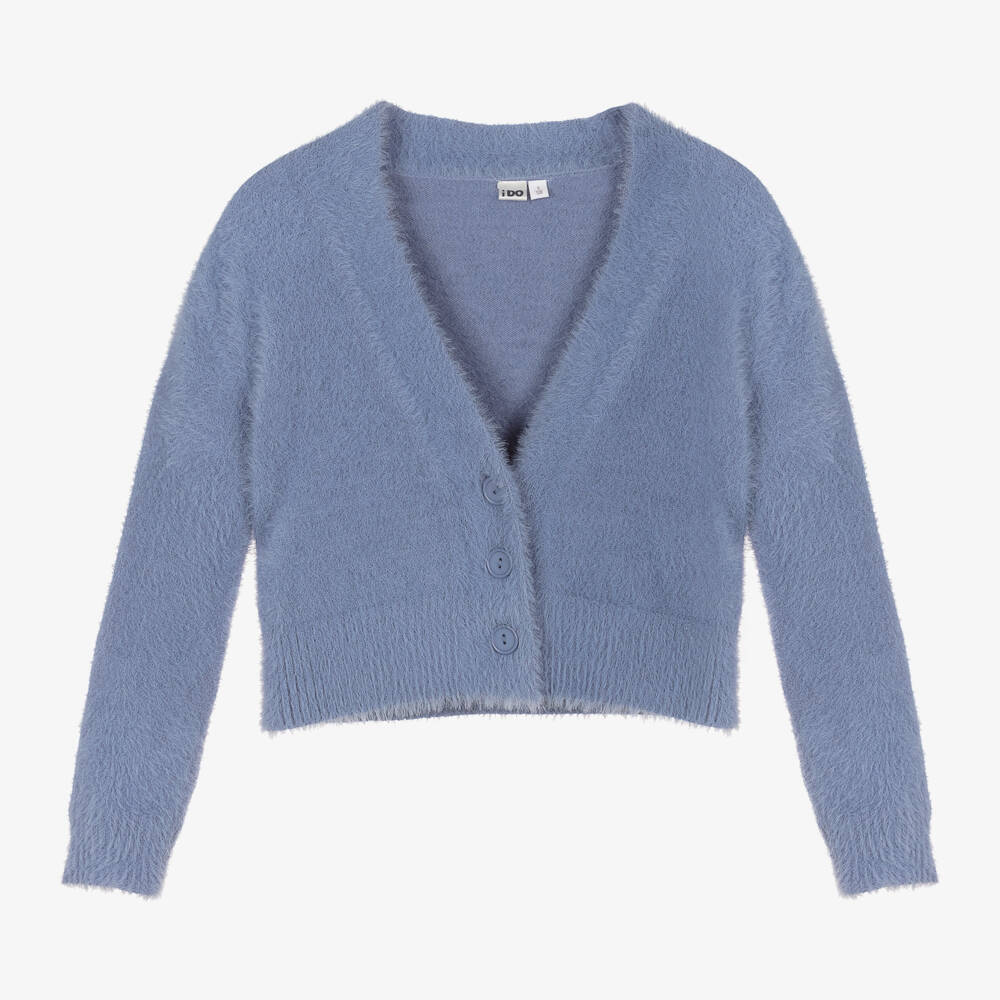 Pale blue fluffy cardigan for girls by Italian brand iDO Junior, knitted with a subtle, metallic blue sparkle. Just right for relaxed days, it is beautifully soft and comfortable, with cosy ribbed trims and large button fastenings on the front.