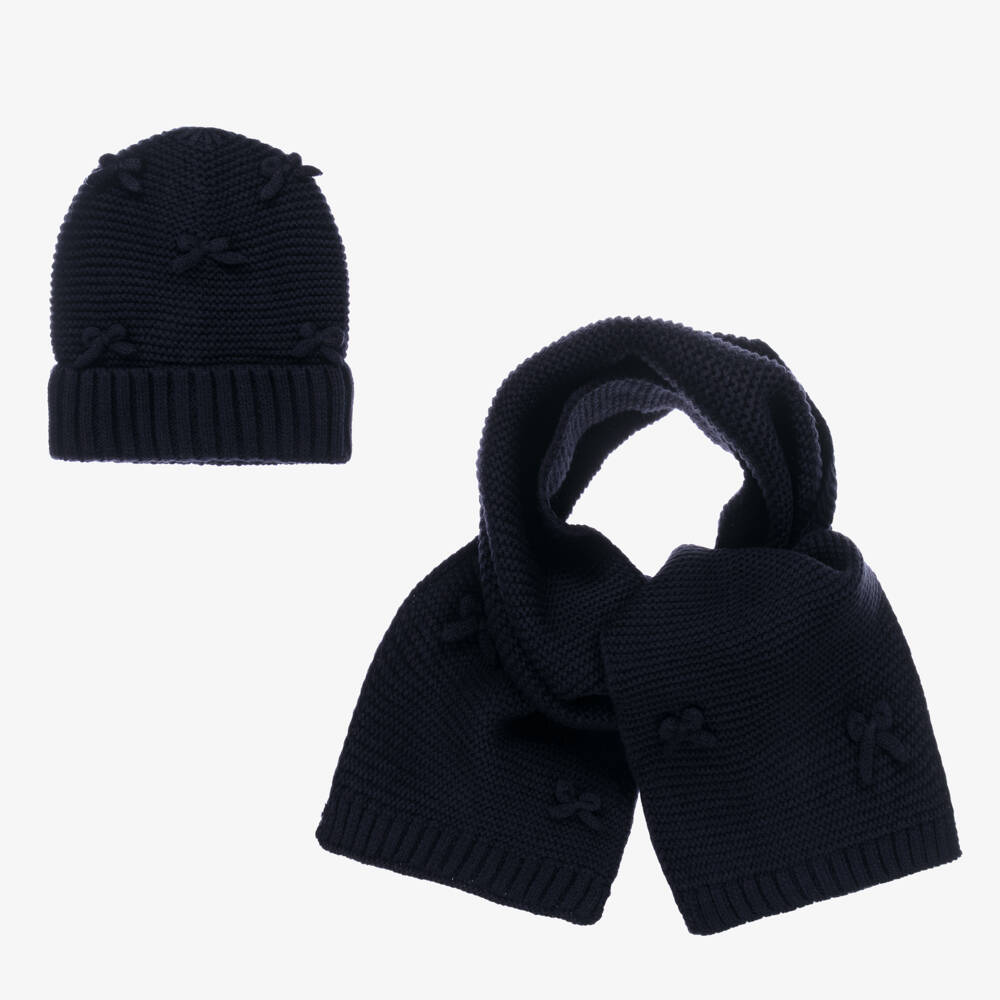 Navy blue hat and scarf set for younger girls by iDO Baby, great for wrapping up warm on cold days. The hat and scarf each have adorable knitted bow appliqués for a sweet look.