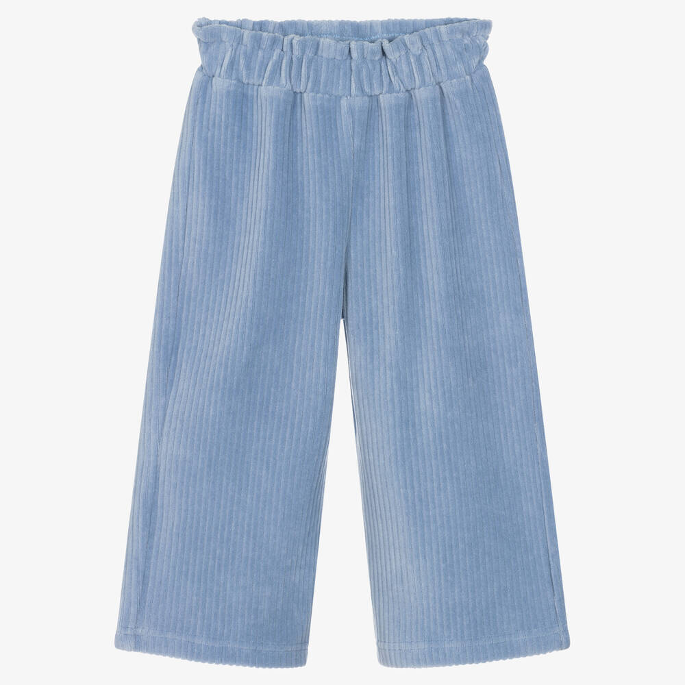 Cornflower blue culottes for girls by iDO Baby, made in soft ribbed velour with the appearance of corduroy. They have a wide leg style and elasticated waist for a comfortable, relaxed fit.