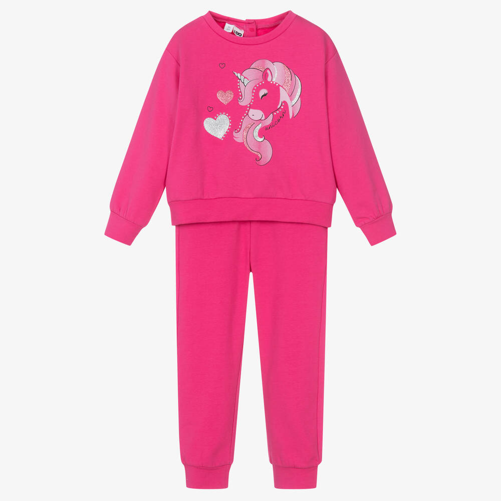 Bright pink tracksuit for girls by iDO Baby, made from soft cotton jersey. The sweatshirt has a pretty pink and silver sparkly unicorn design with diamanté embellishments on the chest, and back button fastenings for a neat finish. The matching joggers have slanted pockets on the front and a comfortable drawstring waist.