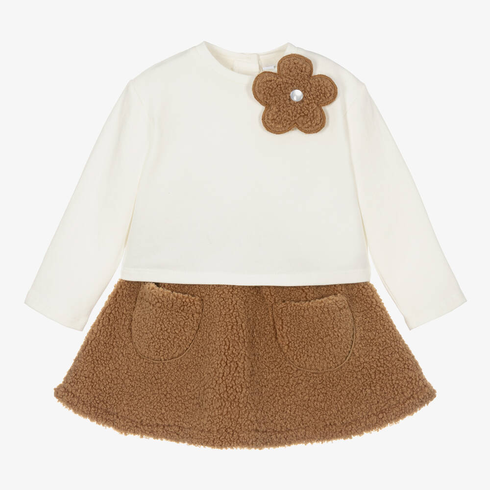 An ivory and brown skirt set for girls from Italian brand iDO Baby. The soft cotton top has a fluffy flower appliqué with a pearlescent centre on the front and buttons on the back to help with dressing. Matching the top's motif, the skirt is made in fluffy bouclé fleece. It has patch pockets, an elasticated waist and satin lining for comfort.