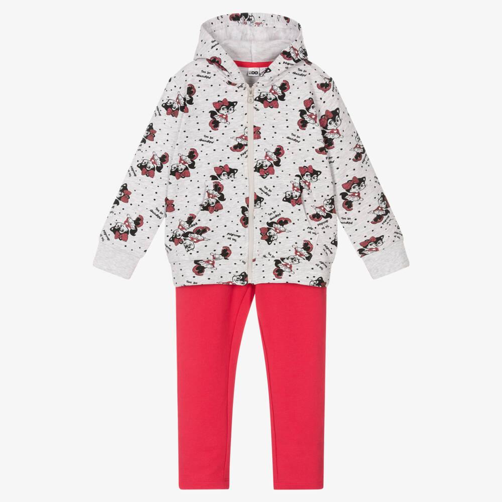 Grey marl and pink cotton tracksuit for little girls from iDO Baby, made in soft and stretchy sweatshirt jersey with a fleecy-feel inside. The zip-up top has useful front pockets and sweet cat prints in black and glittery pink with 'I'm so beautiful' lettering. The matching joggers have side pockets and a useful internal drawstring on the elasticated waist to ensure a great fit.