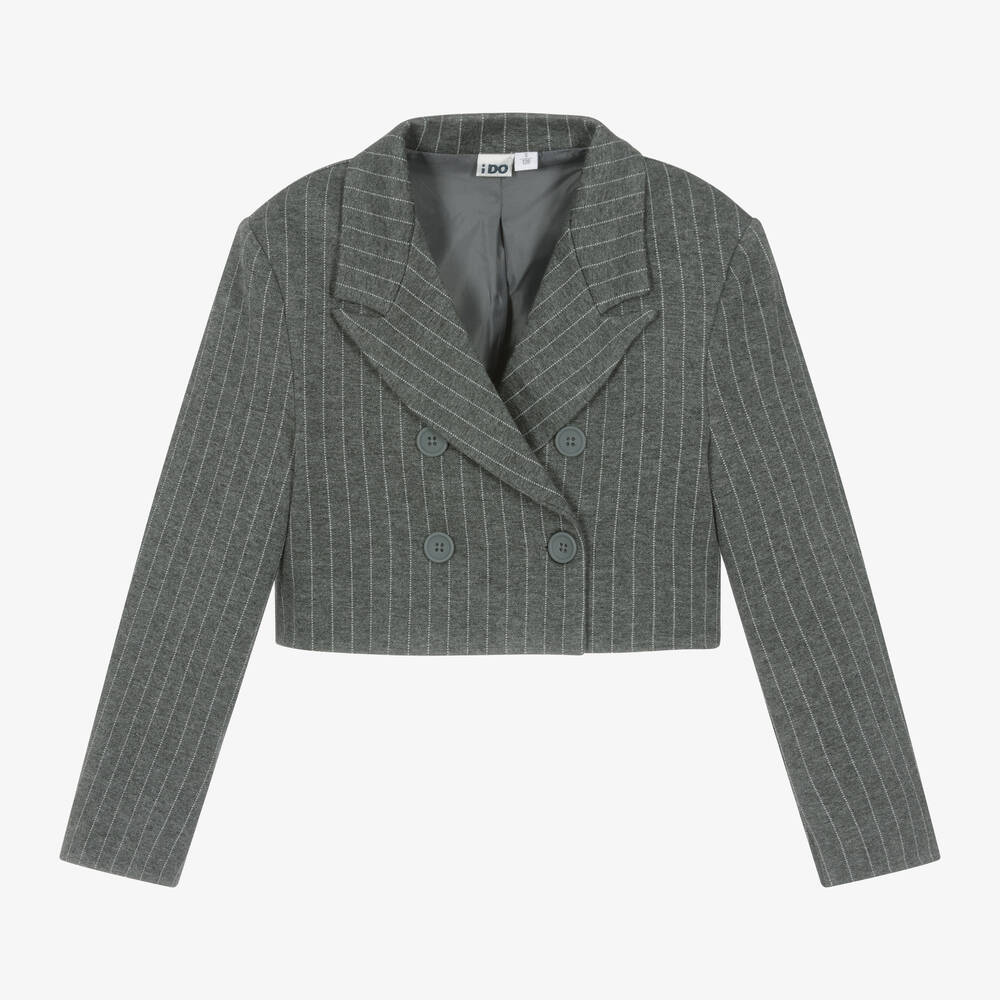 Girls dark grey pinstripe blazer by iDO Junior, in a stylish, cropped length. It has a smart, double-breasted design with tonal grey buttons. The lining is silky and soft, ensuring comfort with every wear.