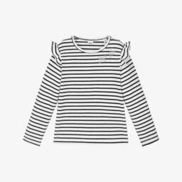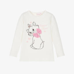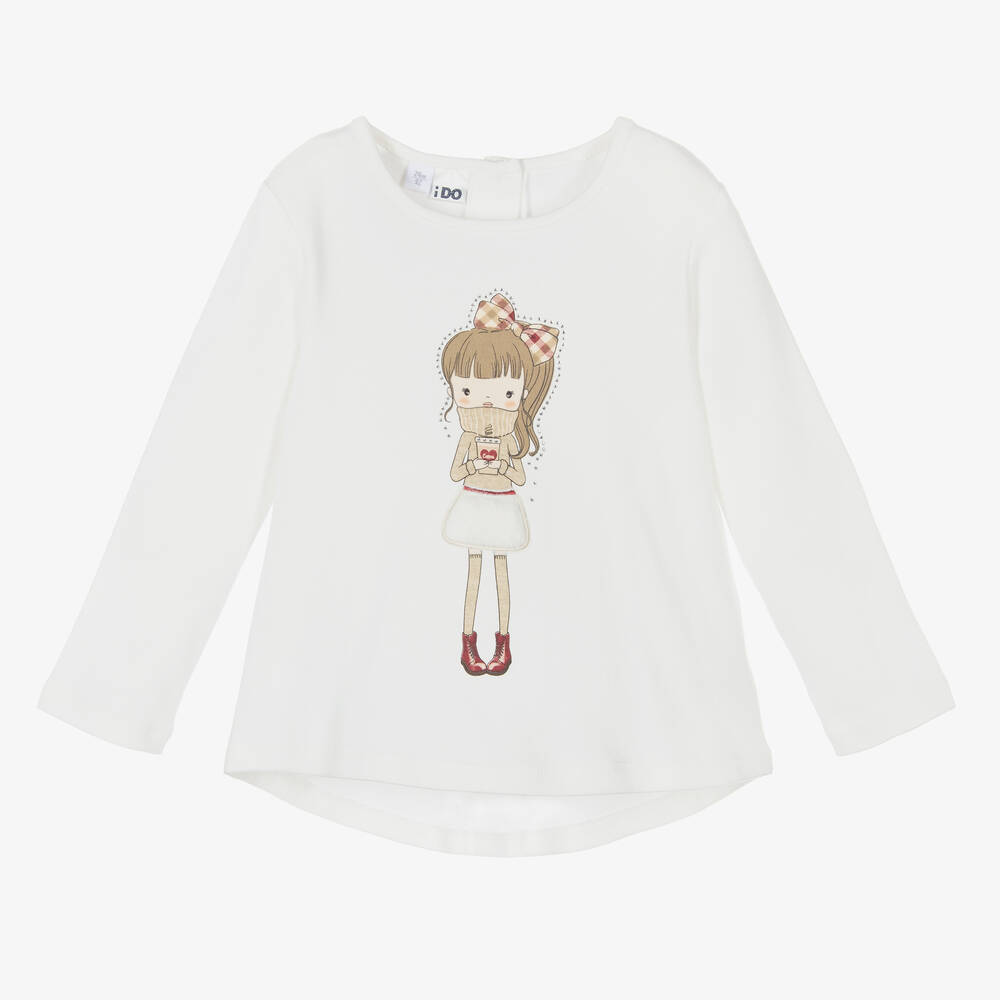 Ivory top for girls by iDO Baby, made in soft cotton jersey. The front has a beige girl print, trimmed with sparkling diamanté and fluffy faux fur. The back has button fastenings and a longer length curved hem.