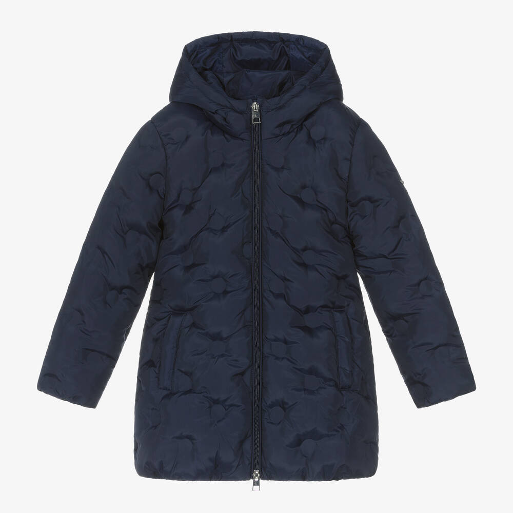 A long navy blue coat for girls by iDO Baby, made in silky smooth fabric with a cushioned, button-back look. Padded for warmth, this zip-up coat has an elasticated hem and a cosy hood for extra coverage in the rain. It has two front pockets and a beautifully soft plush lining.