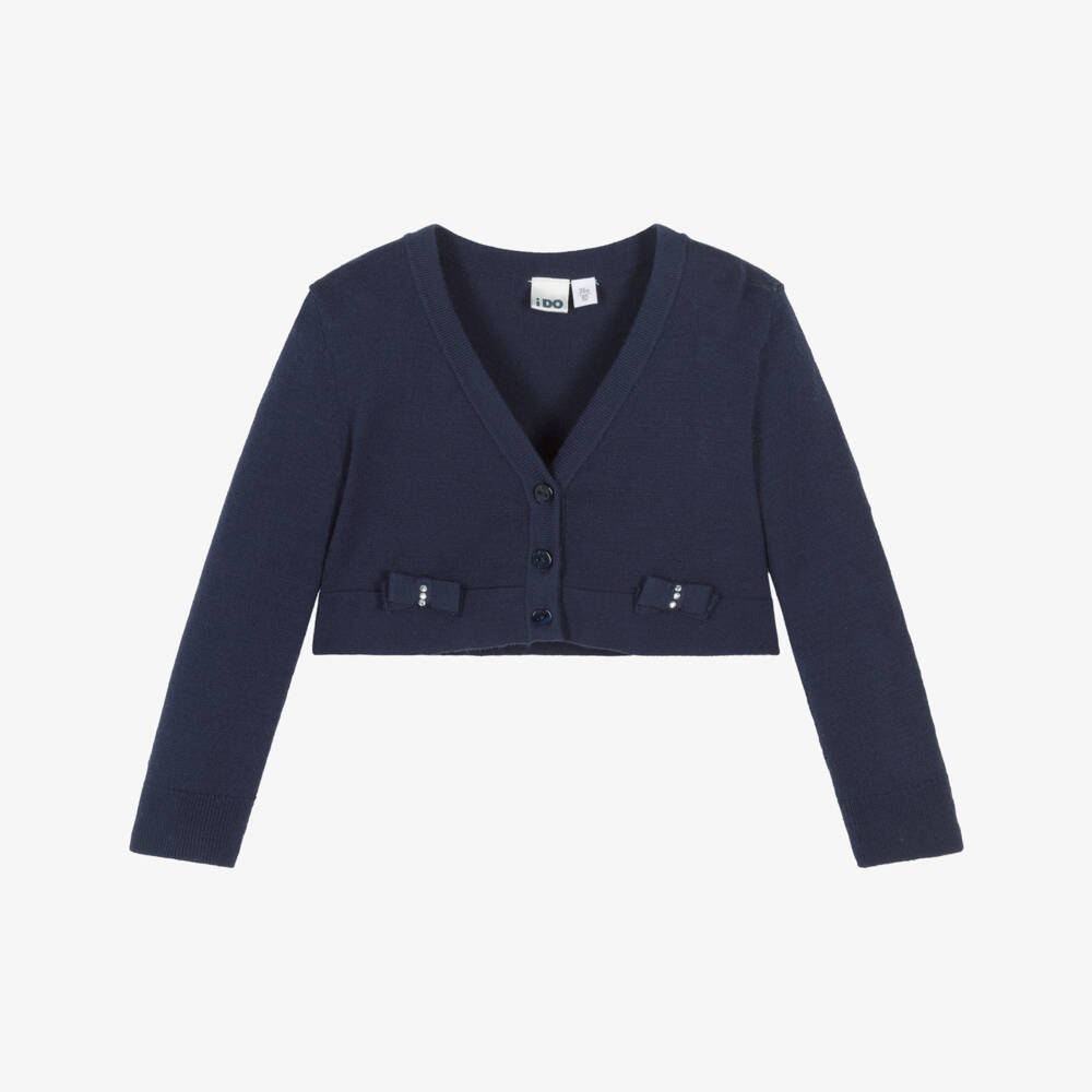 Navy blue cardigan for girls by iDO Baby, made in a beautifully soft viscose blend. Lovely for layering, it has a smart V-neckline and button fastenings. There are decorative bows on the front, trimmed with diamantés for added sparkle.