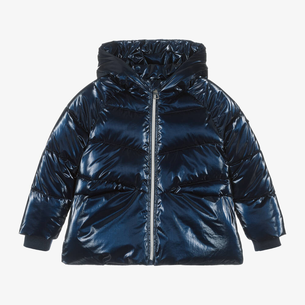 Smooth and shiny, this navy blue hooded puffer jacket for girls is by iDO Baby. Lined in cosy fleece, it has mid-weight padding for extra warmth and stretchy jersey cuffs to help keep out chilly winds. It fastens with an exposed zip down the front, with a chin guard for added comfort.