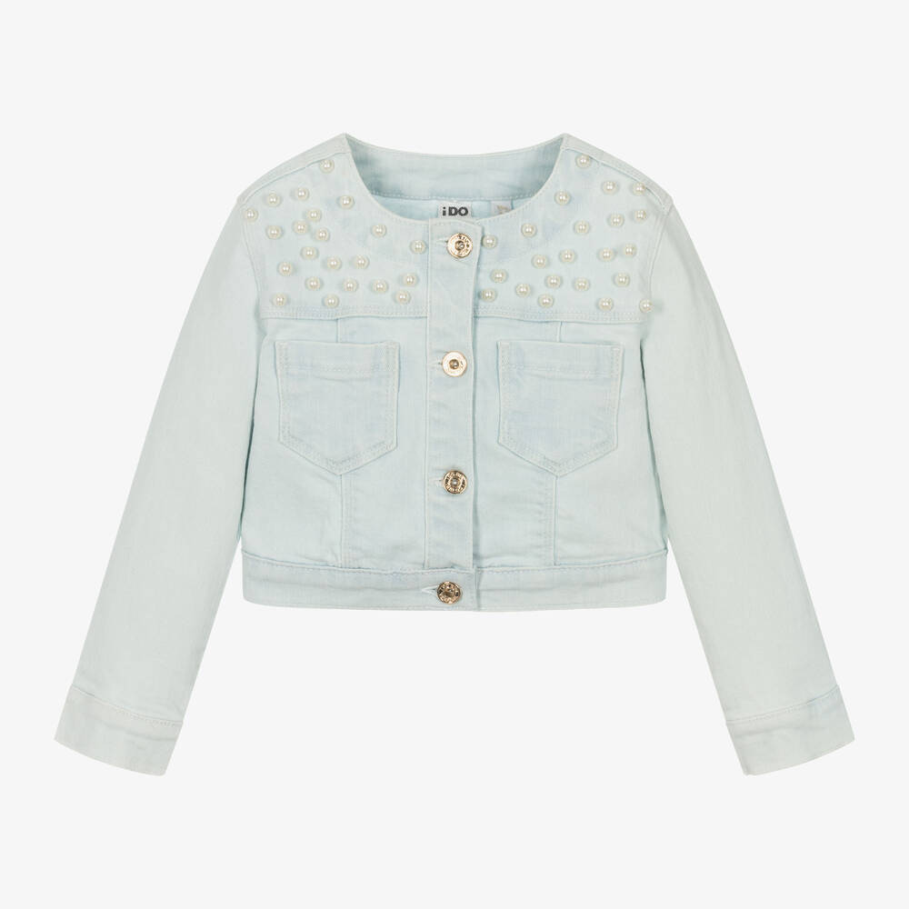 A pale blue bleached wash denim jacket for girls by iDO Junior, made with cotton for comfortable wear. Super cool and with a feminine twist, this collarless jacket has pretty pearl embellishments on the chest for a sweet finish. Fastening with shiny gold buttons on the front and on the cuffs, it has two patch pockets and is styled with a shorter length to sit on the waist.