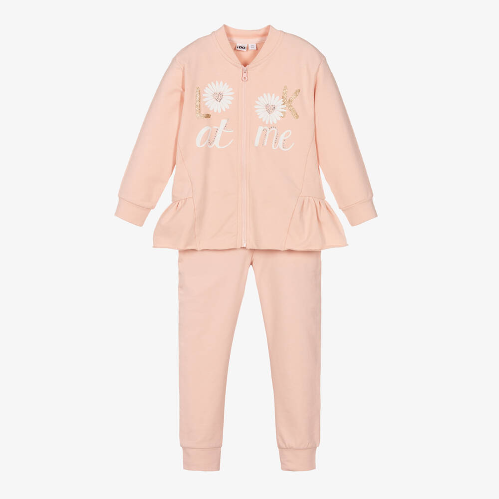 Feminine pale pink cotton tracksuit for girls by Italian brand iDO Baby, made in comfortable jersey for relaxed days. The zip-up top has a pretty, frilled peplum and the words 'Look at me' printed across the front in glittery gold and white with daisy motifs and sparkling diamantés. The joggers have an elasticated waistband and useful jetted side pockets.