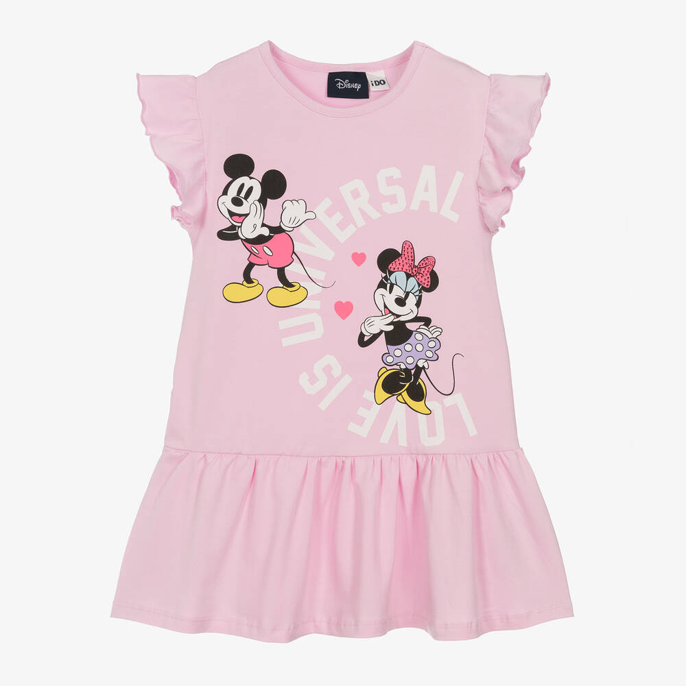 A fun pink dress for girls by iDO Baby, made in soft and comfortable cotton jersey. Ideal for Disney fans, it features cute prints of Mickey and Minnie Mouse, with glittery red diamantés and 'love is universal' in white. This easy-to-wear, slip-on style has pretty flrilled short sleeves and a sweet ruffled hem.