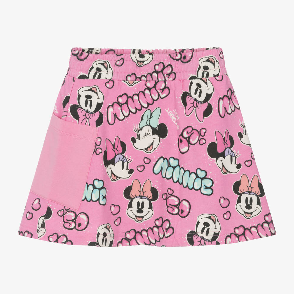 Pink skirt for girls by iDO Baby, made in mid-weight cotton jersey with a fleecy inside. This playful design has a fun Minnie Mouse pattern with hearts and bold graffiti lettering. It has two patch pockets and an elasticated waistband for easy dressing.