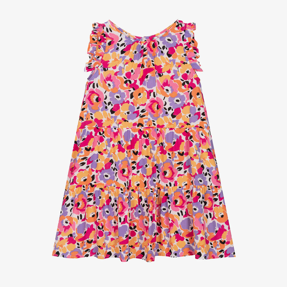 Pretty summery dress for girls by Italian brand iDO Baby, made in super soft, lightweight viscose with a pink, orange and purple floral print on a white background. The bodice is gathered on the neckline, there are feminine frills over the shoulders and full, gathered tiers on the skirt. The dress fastens with a logo button around the back.