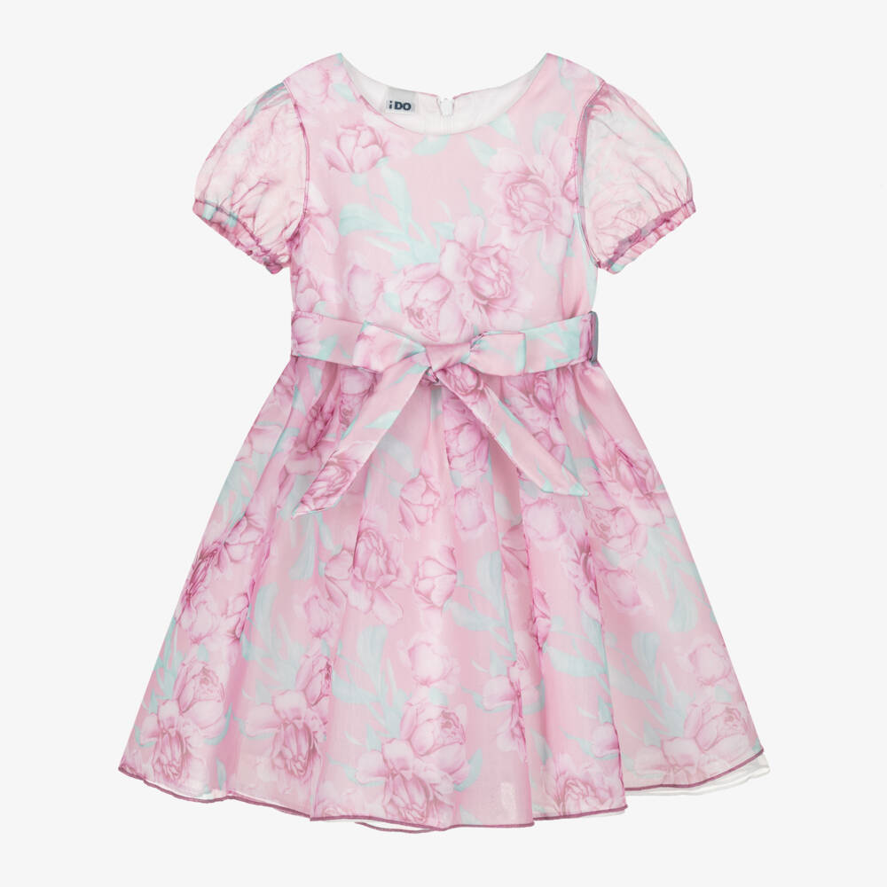A gorgeous pink dress for girls by iDO Baby, made from delicate sheer organza. It has a dreamy floral pattern with voluminous puff sleeves and a removable belt that ties into a bow. A concealed zip fastens on the back and the dress in comfortably lined in soft cotton voile.
