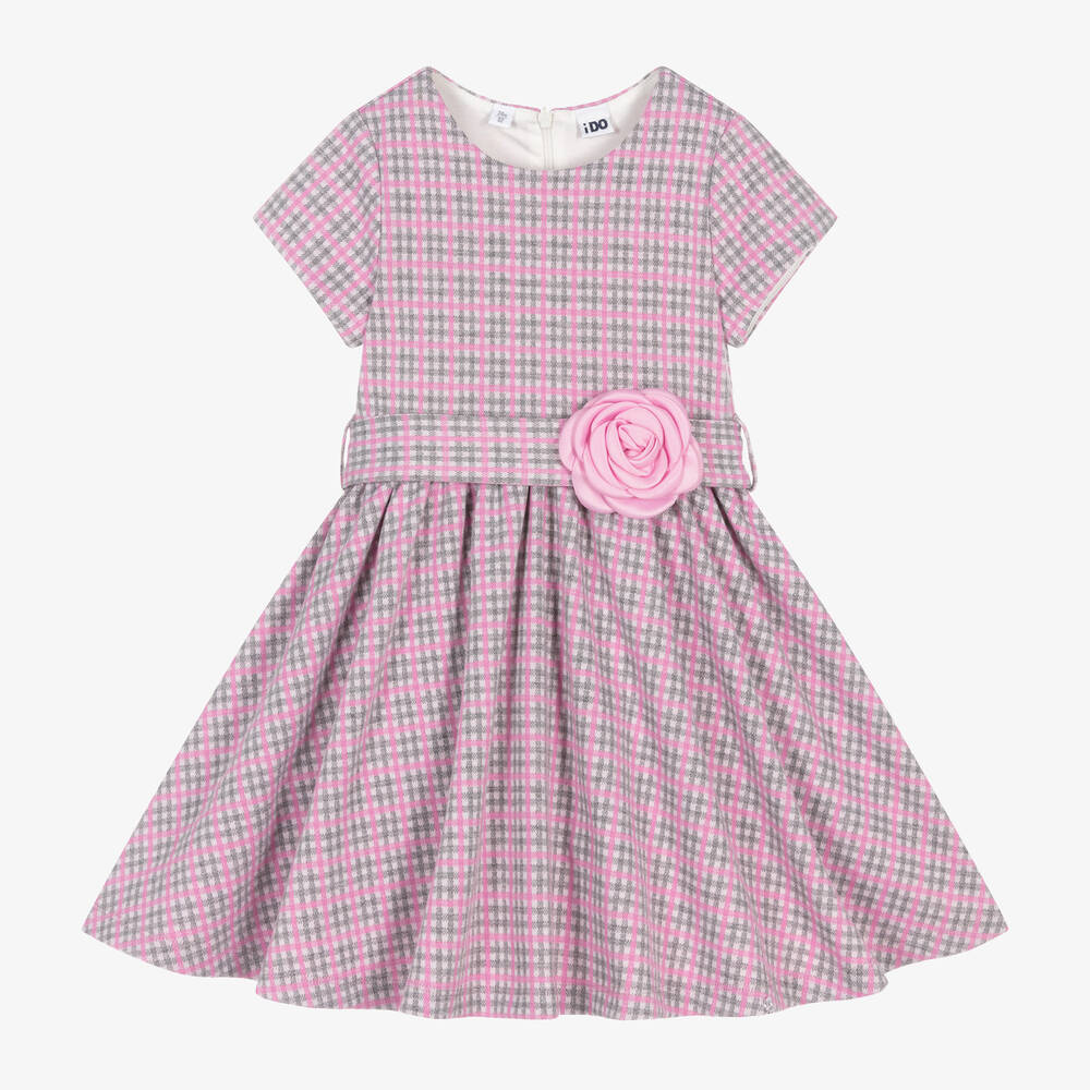 A pretty pink and grey check dress for girls by iDO Baby. Made in a super soft jersey knit, the bodice is lined with stretchy jersey and the skirt has a lightweight cotton lining with a panel of tulle for extra volume. Fastening with a concealed zip on the back, this short-sleeved style has a detachable belt, tying neatly on the back and embellished with a satin rose on the front.
