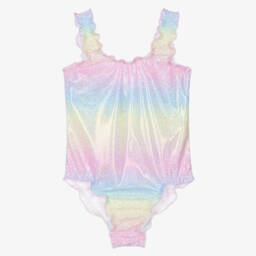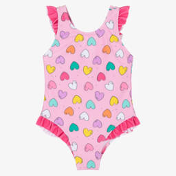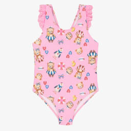 Patterned in red strawberries, this fun pink gingham swimsuit set for girls is by iDO Baby. Silky smooth and stretchy, it has ruffle straps and is fully lined for comfort. It comes with a matching headband to complete the look.