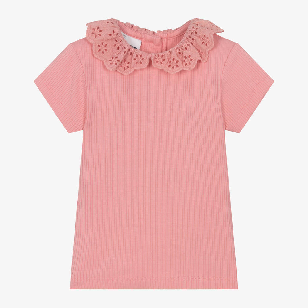 A lovely pink short-sleeved T-shirt for girls by iDO Baby, made from soft viscose ribbed jersey. Sweetly styled, it has a pretty broderie anglaise frilled collar, for an added feminine touch. There are pearlescent button fastenings on the back.