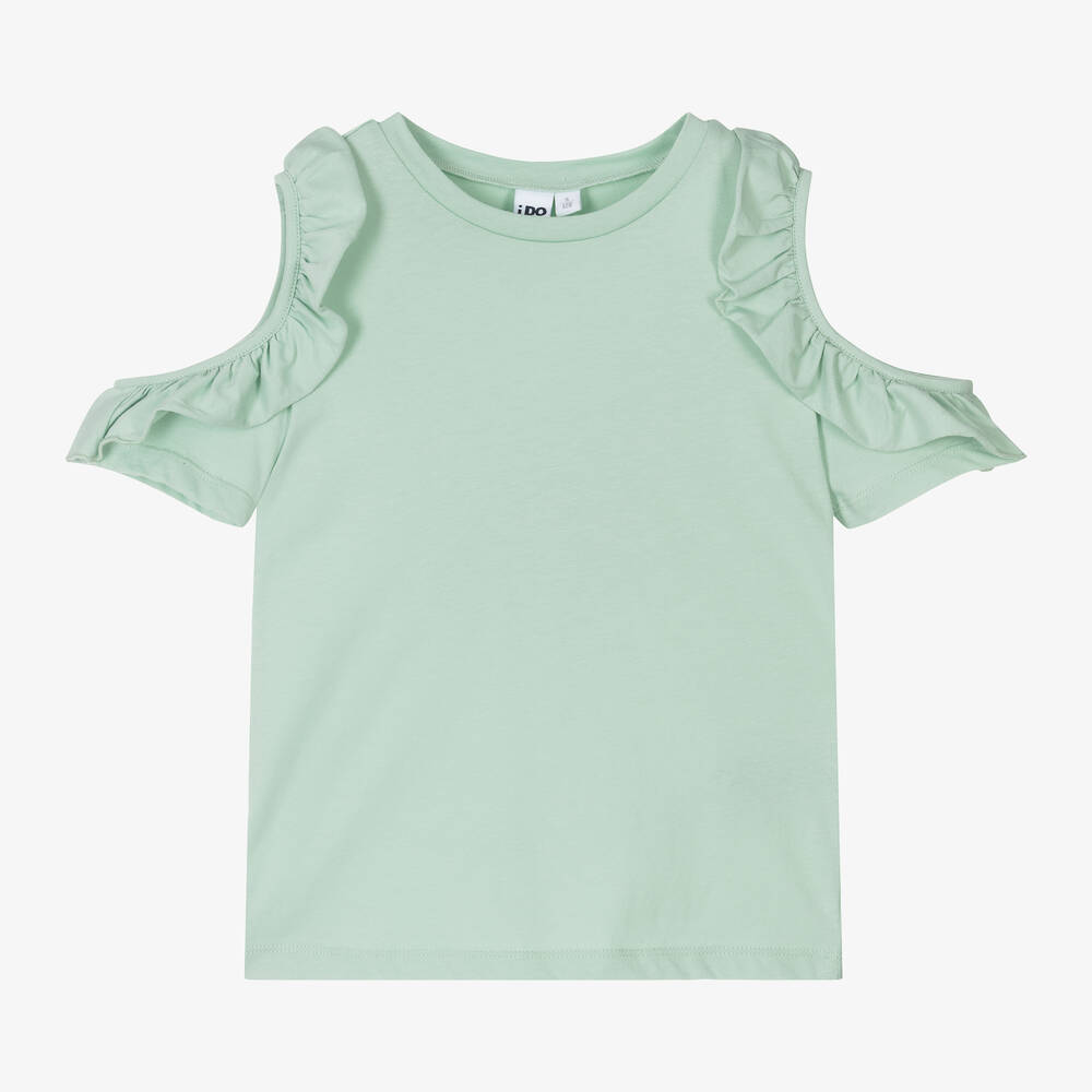 Pretty sage green T-shirt for older girls by iDO Junior, made in soft cotton jersey. This short-sleeved tee has a lovely cut-out shoulder design for a contemporary look, trimmed with girly ruffles for added style.