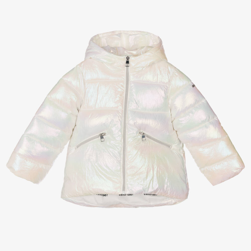 Metallic silver puffer jacket for girls, by iDO Baby. Made in soft and smooth nylon, it has a pretty holographic finish, a shiny silver zip fastening, and cosy padding for warmth.