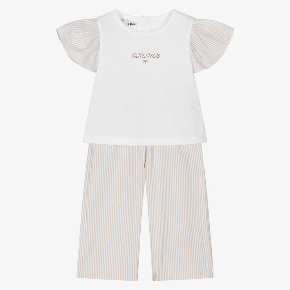 A beige and white striped cotton trouser set for girls by iDO Baby. The soft, comfortable, white jersey T-shirt has striped poplin flutter sleeves and features the word 'amour' in sparkly gold diamantés on the front. Cool and lightweight, the wide-leg, poplin trousers have a comfortable elasticated waist, with a fixed sash belt to tie at the front.