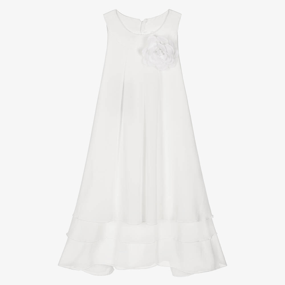 White dress for girls by Italian brand iDO Junior, made in delicate layers of chiffon with a soft silky lining. It has a tulle flower appliqué on the front and diamanté button fastenings on the back.