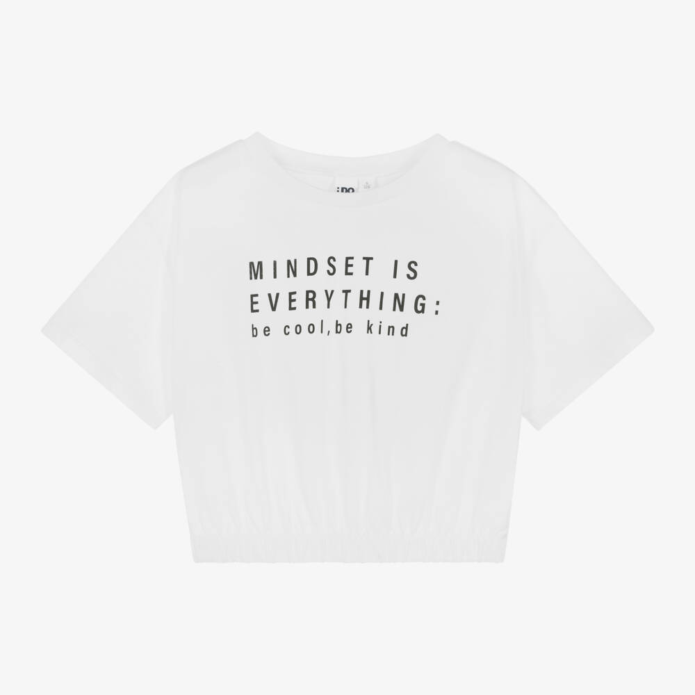 Stylish white slogan T-shirt for girls by iDO Junior, made in soft cotton jersey. 'Mindset is everything. Be cool, be kind.' is printed on the front in black, adding a positive twist to this short-sleeved, shorter-length tee.