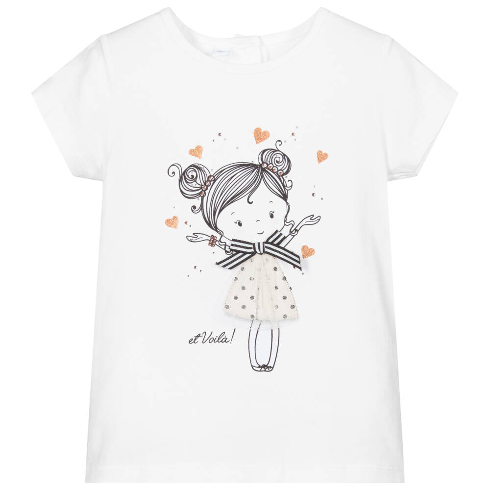 White T-shirt for girls by iDO Baby, made in soft and stretchy cotton jersey. It has a cute girl print in black, with tulle and diamanté trims and rose gold glitter hearts.