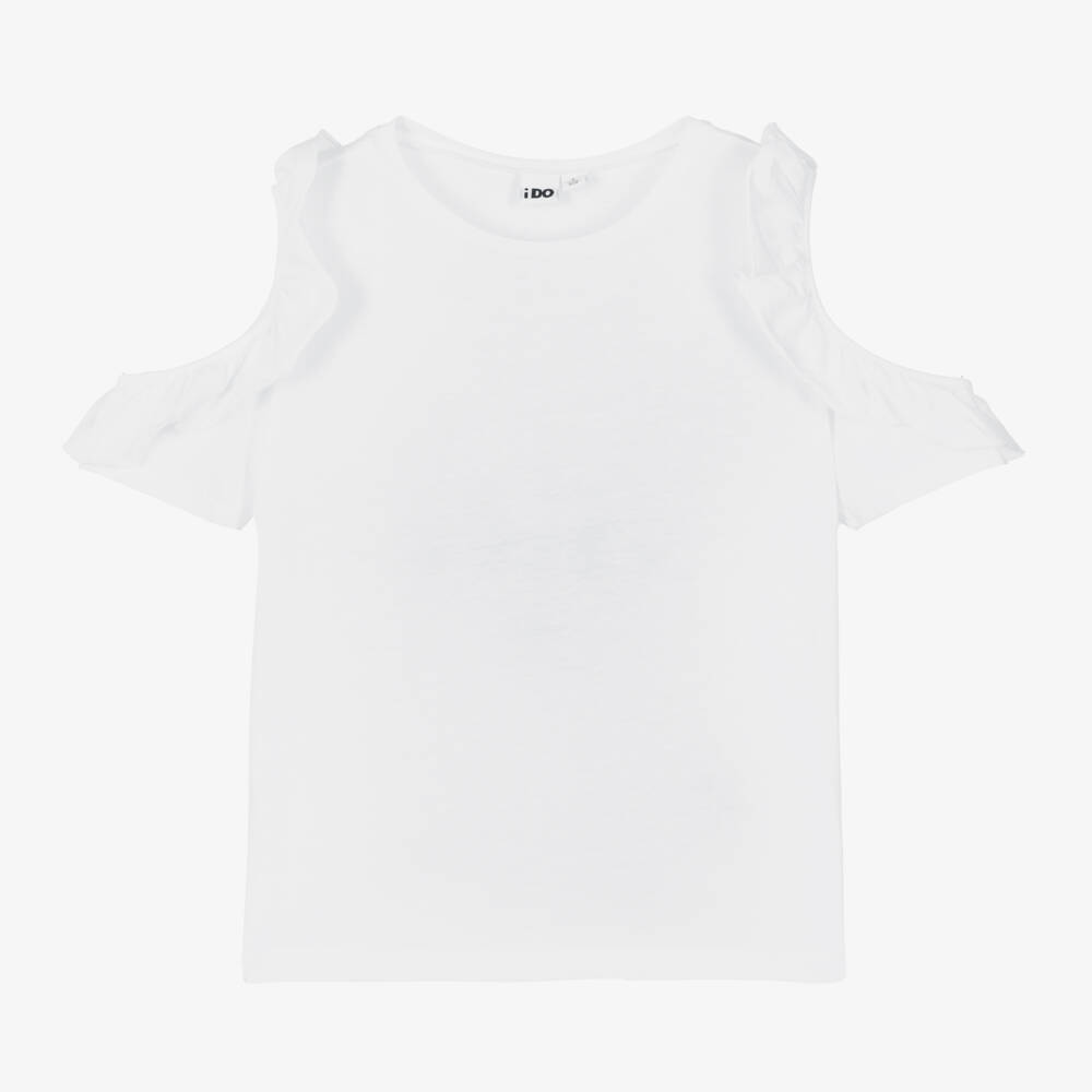 Pretty white T-shirt for older girls by iDO Junior, made in soft cotton jersey. This short-sleeved tee has a lovely cut-out shoulder design for a contemporary look, trimmed with girly ruffles for added style.