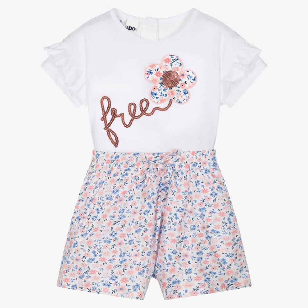 Gorgeous white shorts set for girls by Italian brand iDO Baby. The cotton jersey T-shirt has a flower design with 'free' in rose gold sequins and ruffle-trimmed sleeves. There are useful button fastenings on the back. Patterned in a ditsy pink and blue floral print, the shorts have a stretchy drawstring waist and front pockets.