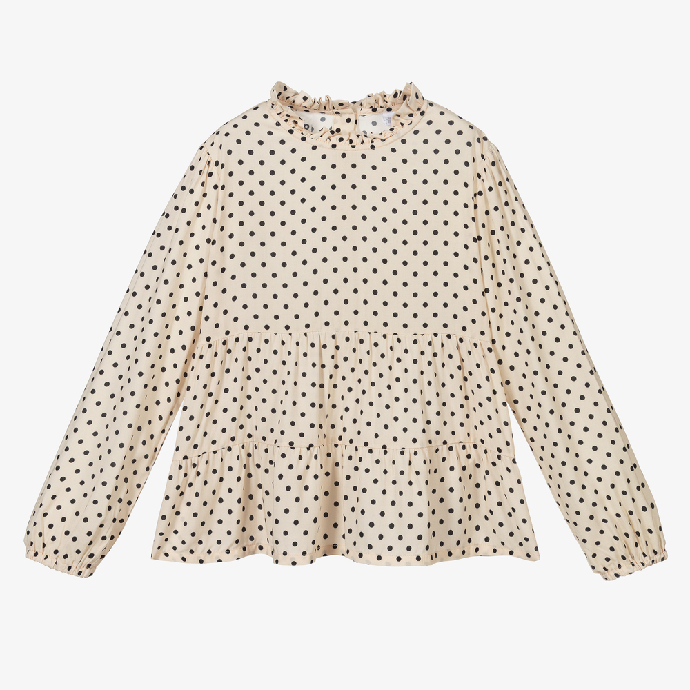 Ivory blouse for girls by iDO Junior. Made with silky and lightweight viscose, this long-sleeved blouse has a black polka dot print, delicate frills on the neckline, and a tiered hem. It fastens with pearlized buttons on the back.
