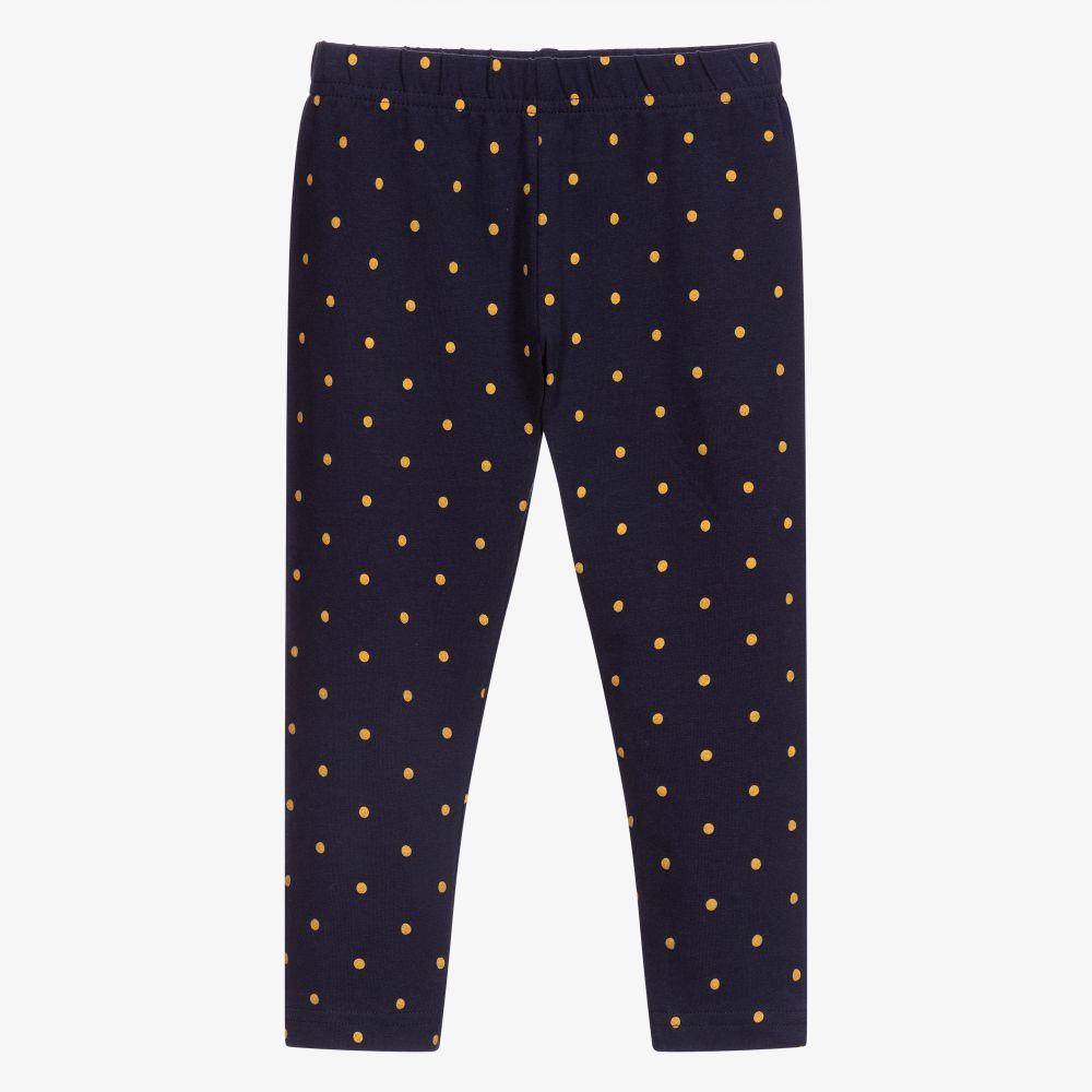 Girls navy blue leggings with a yellow polka dot print by iDO Baby. They are made in soft and stretchy cotton jersey with a comfortable, elasticated waistband.