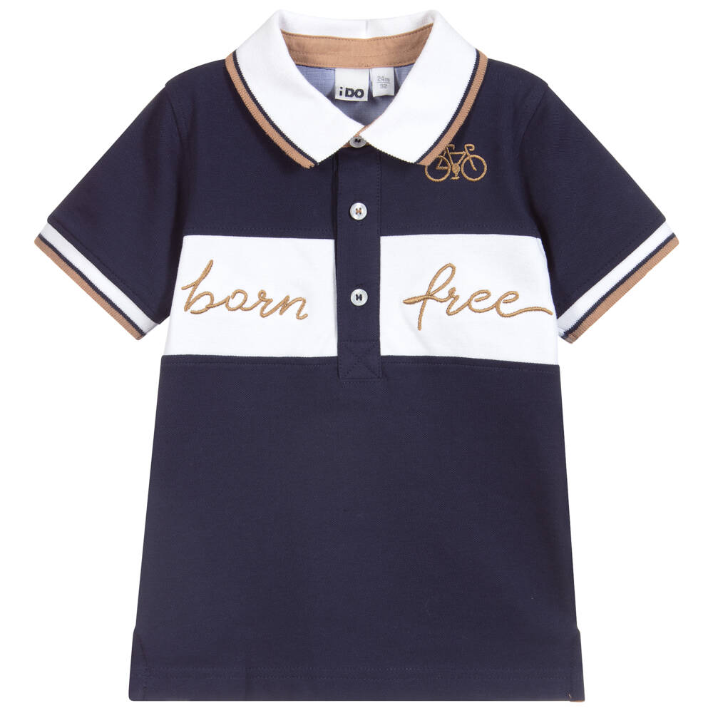 Younger boys smart navy blue polo shirt by iDO Baby. Made in soft, stretchy cotton piqué, it has a white ribbed collar, with beige and navy blue stripes on the matching trim. There are button fastenings on the front, with the words 'Born Free' in beige embroidery on a white panel.