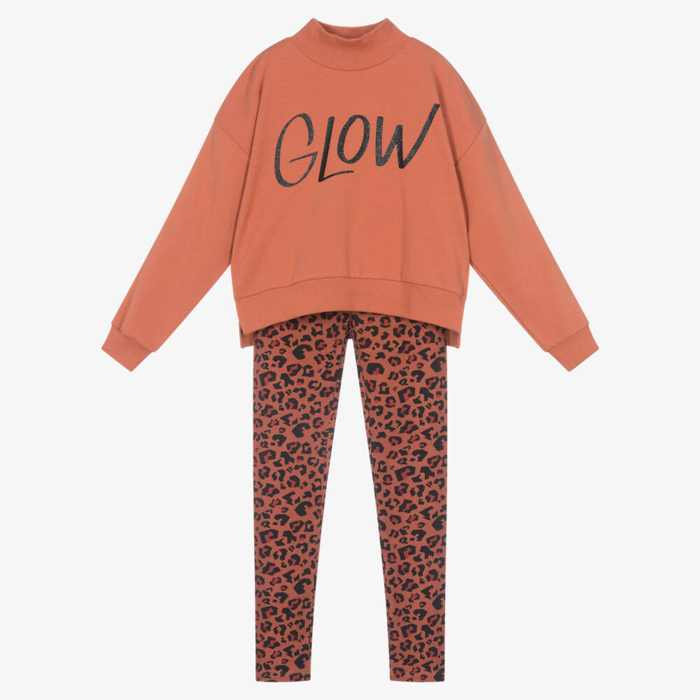 Lovely rust orange leggings set for girls, by iDO Junior. Made in soft cotton jersey with a fleecy inside, the high neck sweatshirt has 'GLOW' printed on the front in black glitter, and split side seams. It pairs with fun leopard print leggings to complete the stylish, yet comfortable set.