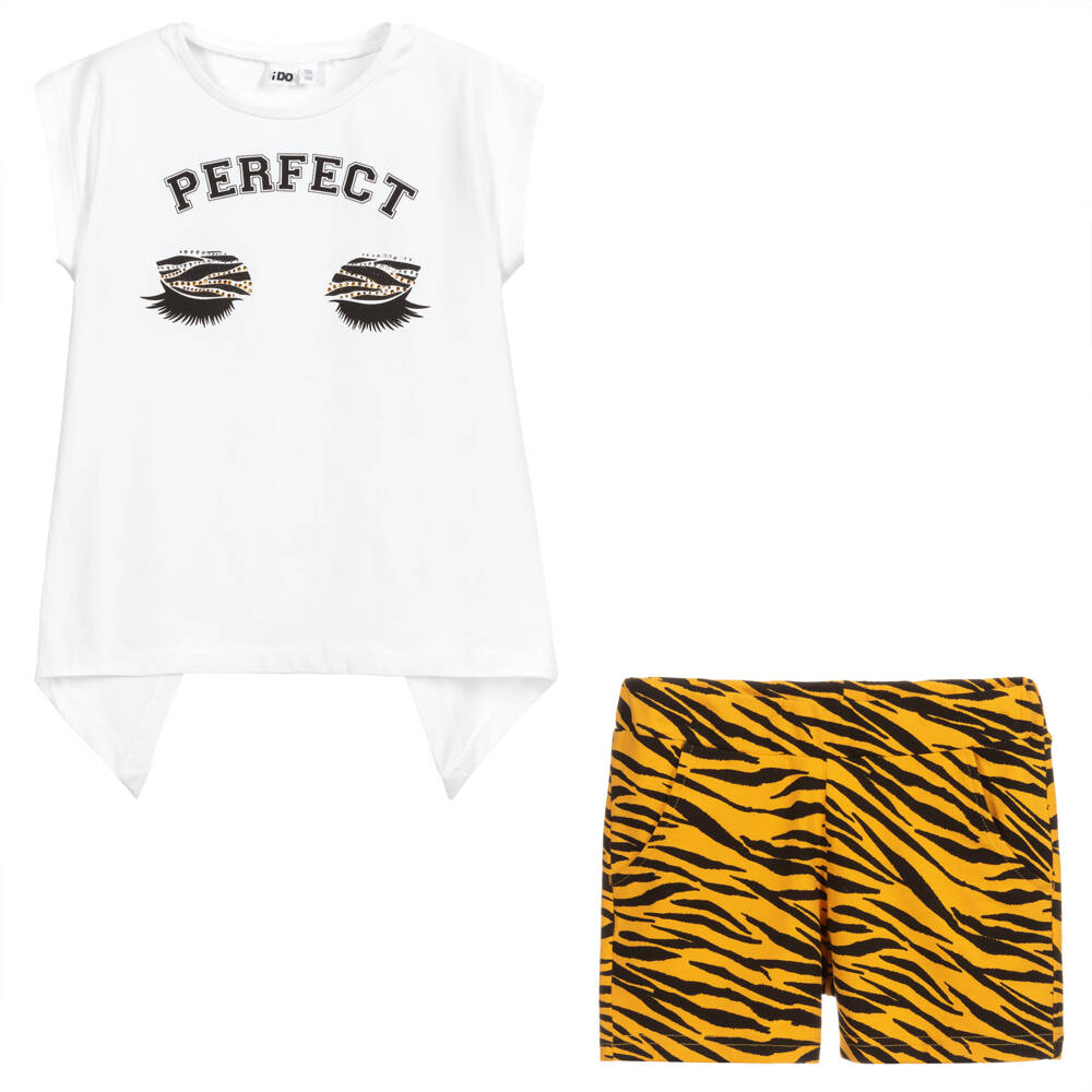 Teen girls will go wild for this shorts set by iDO Junior, made in soft and stretchy cotton jersey. The white T-shirt has eyes printed on the front in black, with silver and gold diamantés trims. The shorts have an all over orange and black tiger print, front pockets and a comfortable elasticated waistband.