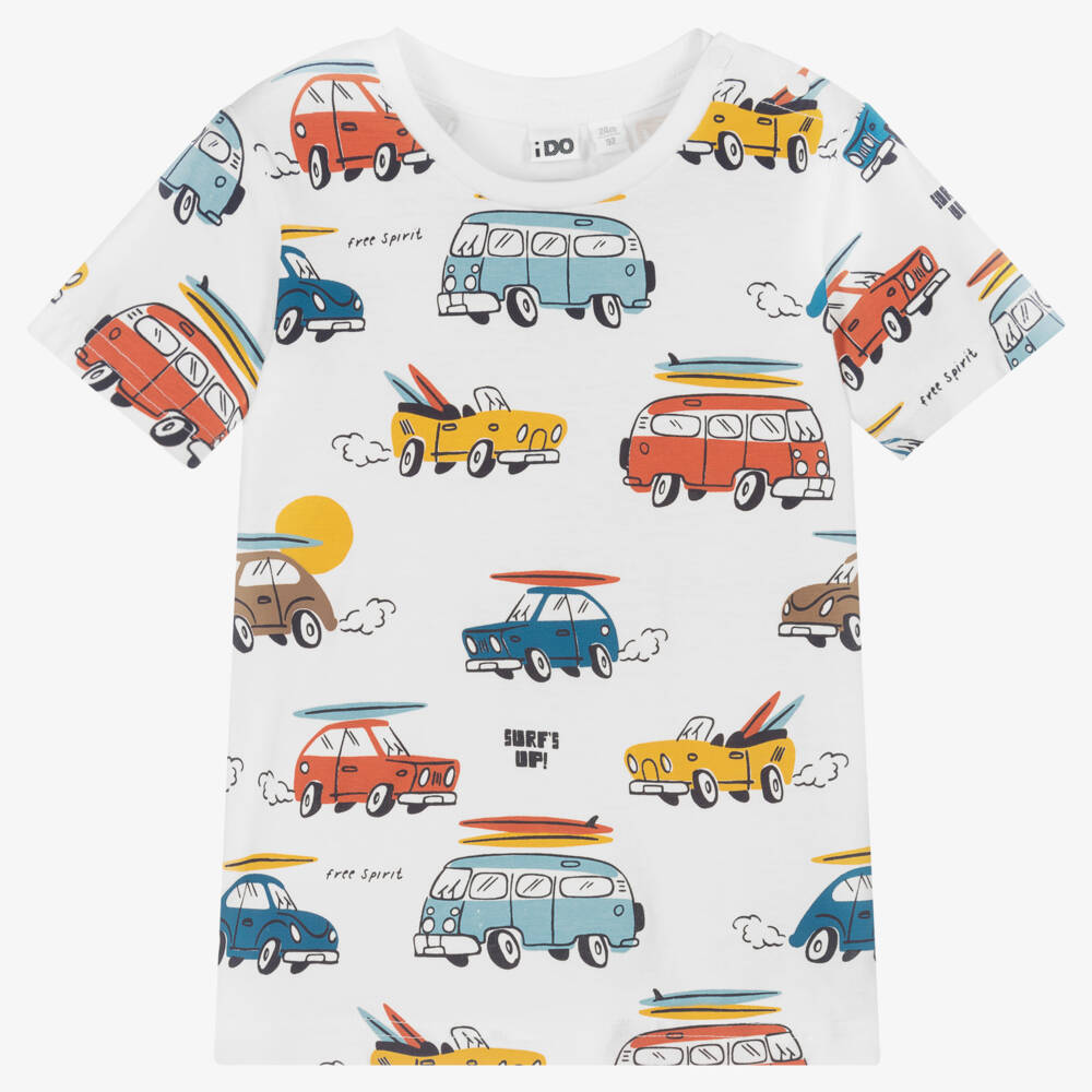 A great addition to their casual wardrobe, this white T-shirt for boys is by iDO Baby. It is patterned in a fun beach-themed car print in orange, blue and red. Made in soft and comfy cotton jersey, it has easy-fastening shoulder poppers on the smaller sizes.
