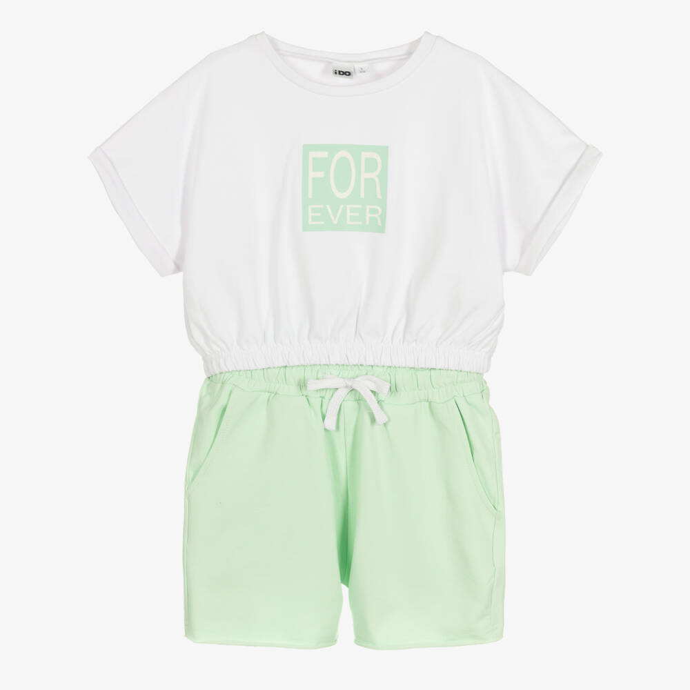A white and mint green shorts set for girls from Italian brand iDO Junior, made in soft and stretchy cotton sweatshirt jersey. In a cool cropped fit, the T-shirt is designed with a glittering 'Forever' box graphic on the front, an elasticated hem for shape and turn-up cuffs. The shorts have handy front pockets and drawstrings on the elasticated waist for a comfortable fit.