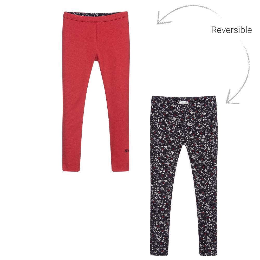Little girls reversible 2-in-1 leggings, by IKKS. Made in double layered cotton jersey, they are red on one side with navy blue and white logo and bird print on the other. They have a comfortable elasticated waist and are long length.