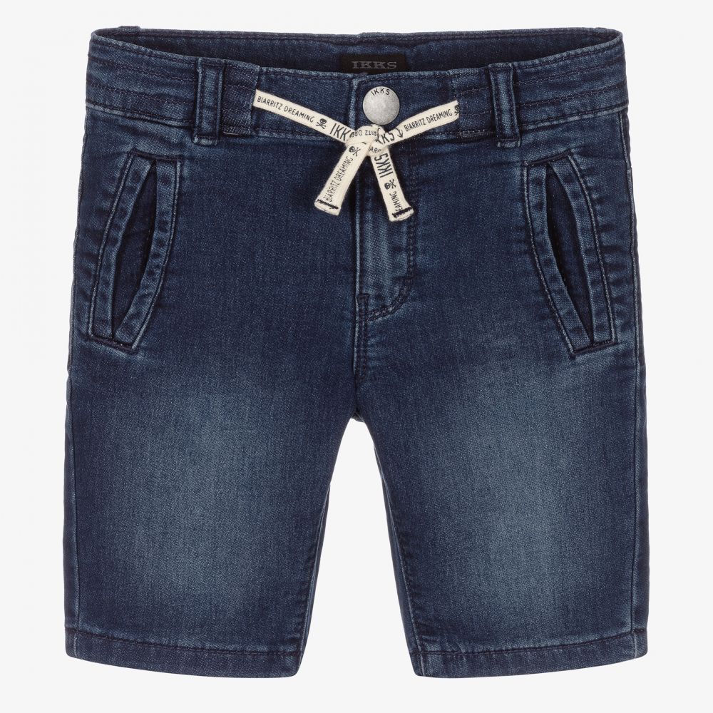 Boys mid-blue cotton denim shorts by IKKS. Comfortable with a slight stretch, they have two pockets on the front and back. The adjustable waist is detailed with decorative drawstrings in ivory, printed with fun skull logo and 'Biarritz dreaming'. They fasten with a hook and zip on the front.