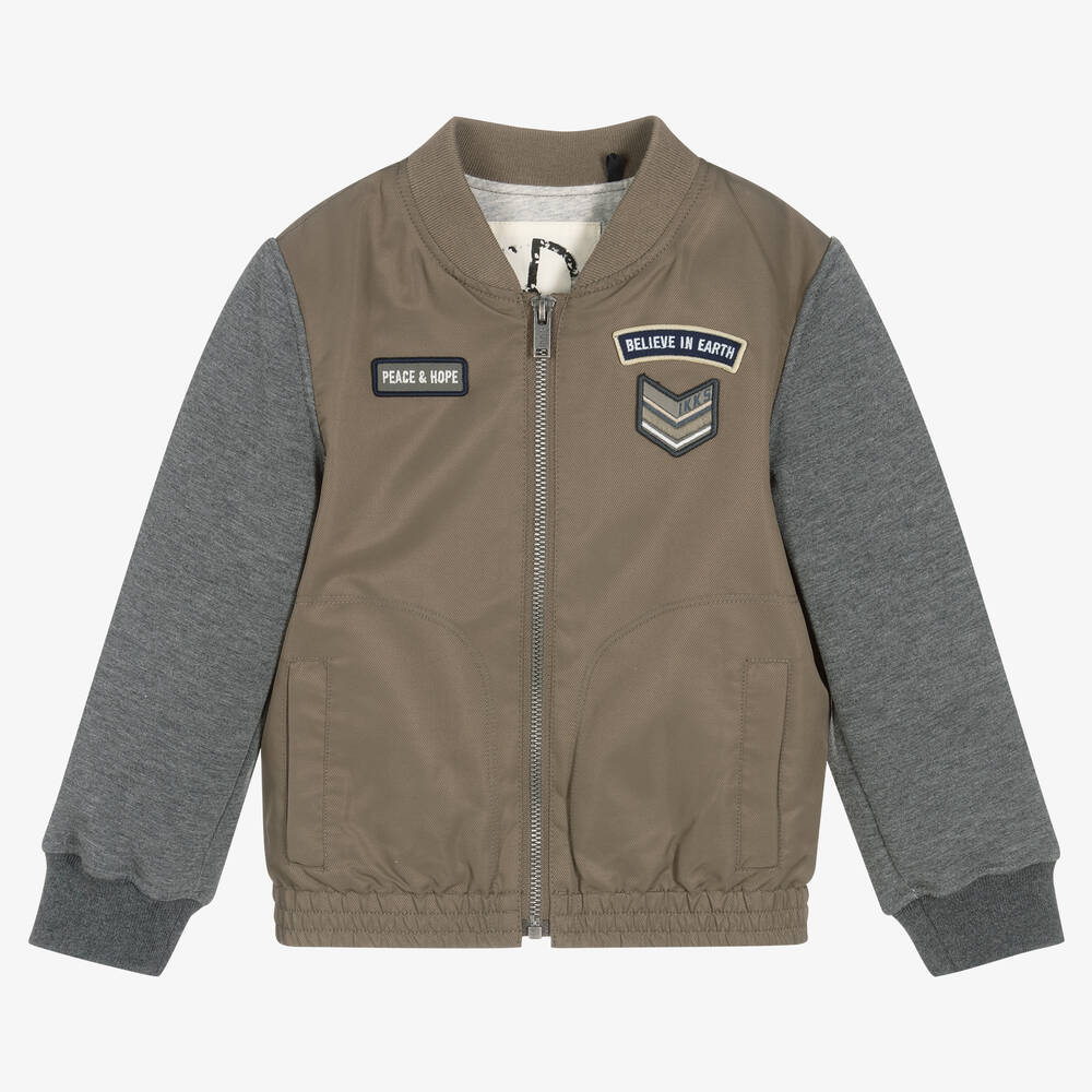 Khaki green with grey marl sleeves, this stylish bomber jacket for boys is by IKKS. It is made in smooth twill fabric and has a comfortable cotton jersey lining. There are slogan patches on the front, a ribbed collar and cuffs, and an elasticated hemline for a snug fit. It has useful front pockets and an exposed zip fastening with a branded puller.