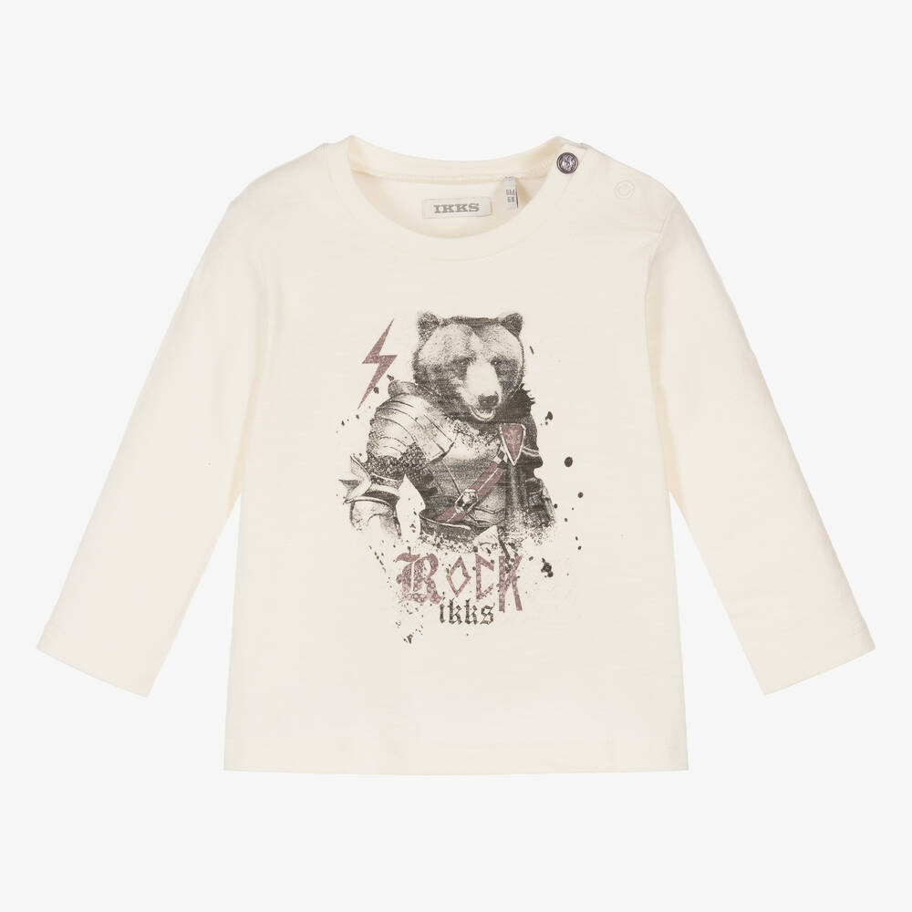 Ivory top for little boys by French brand IKKS, made in comfortable organic slub cotton jersey. It has a bear dressed as a knight printed on the front in grey and purple, with 'Rock' and a logo printed below. There are useful popper fastenings on one shoulder.