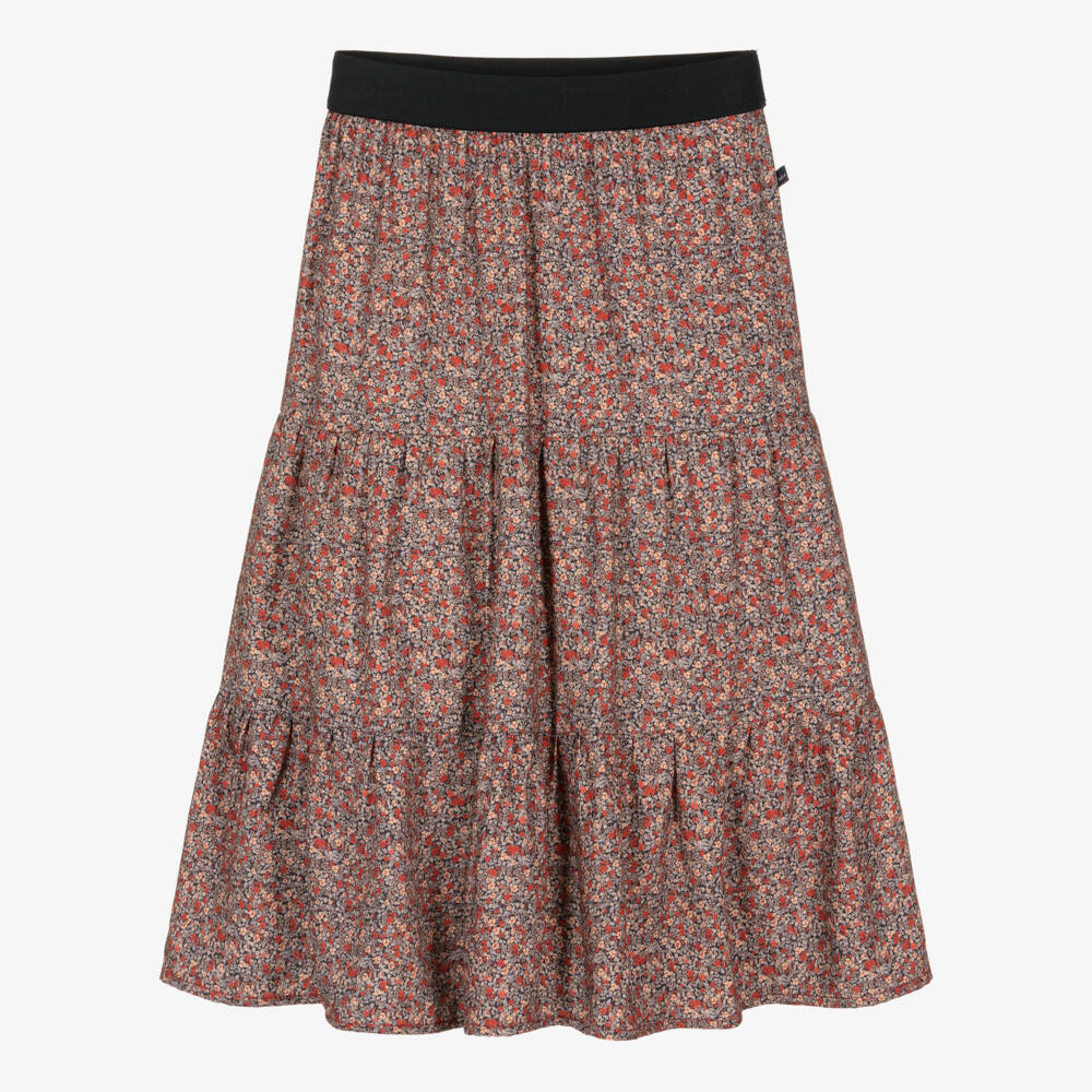 Pretty floral maxi skirt for girls by French brand IKKS, made in super soft viscose twill. With a pink, red and grey floral pattern, the skirt has pretty tiers and a sparkly navy blue elasticated waistband. It has a logo tab on one side seam and is easy to wear, simply pulling on.