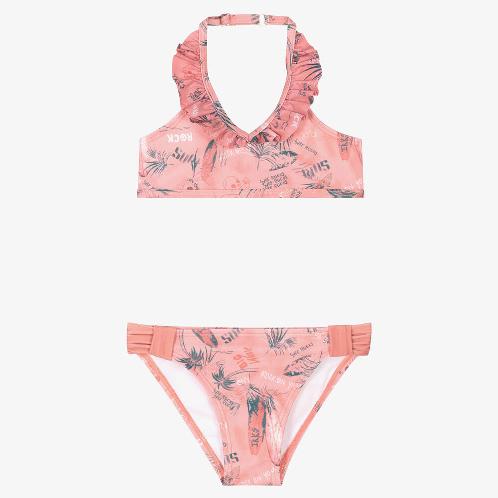 Coral pink bikini for girls by French brand IKKS, patterned in a cool surfboard, palm tree and skull print. Soft and smooth with a comfortable lining, the V-neck top has a ruffle trimmed front and useful adjustable straps. The matching bottoms are beautifully finished with a surfboard-shaped charm logo on the back.