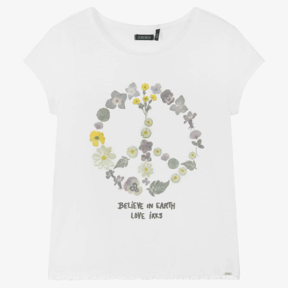 White T-shirt for girls by French brand IKKS, made in soft and comfortable cotton jersey. It has a glittery floral peace sign printed with a 'Believe in Earth' embroidery on the front. There is a charm logo and a crocheted hemline.